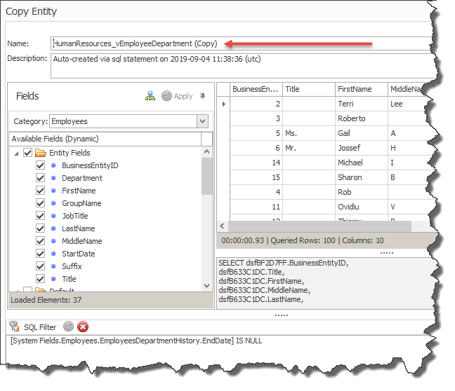 IMPORTANT: Published Views DO NOT reveal the filters applied to Entities, however, if you give the user the ability to view the generated SQL query with the Show SQL option , they can copy the query and manually remove the filter. If you're concerned with security, never enable this option.