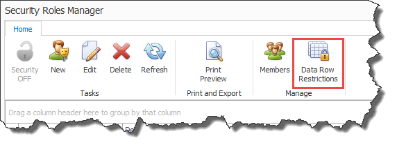 Data Row Restrictions Manager can be access from the Manage section of the Home tab on the Security Roles Manager: